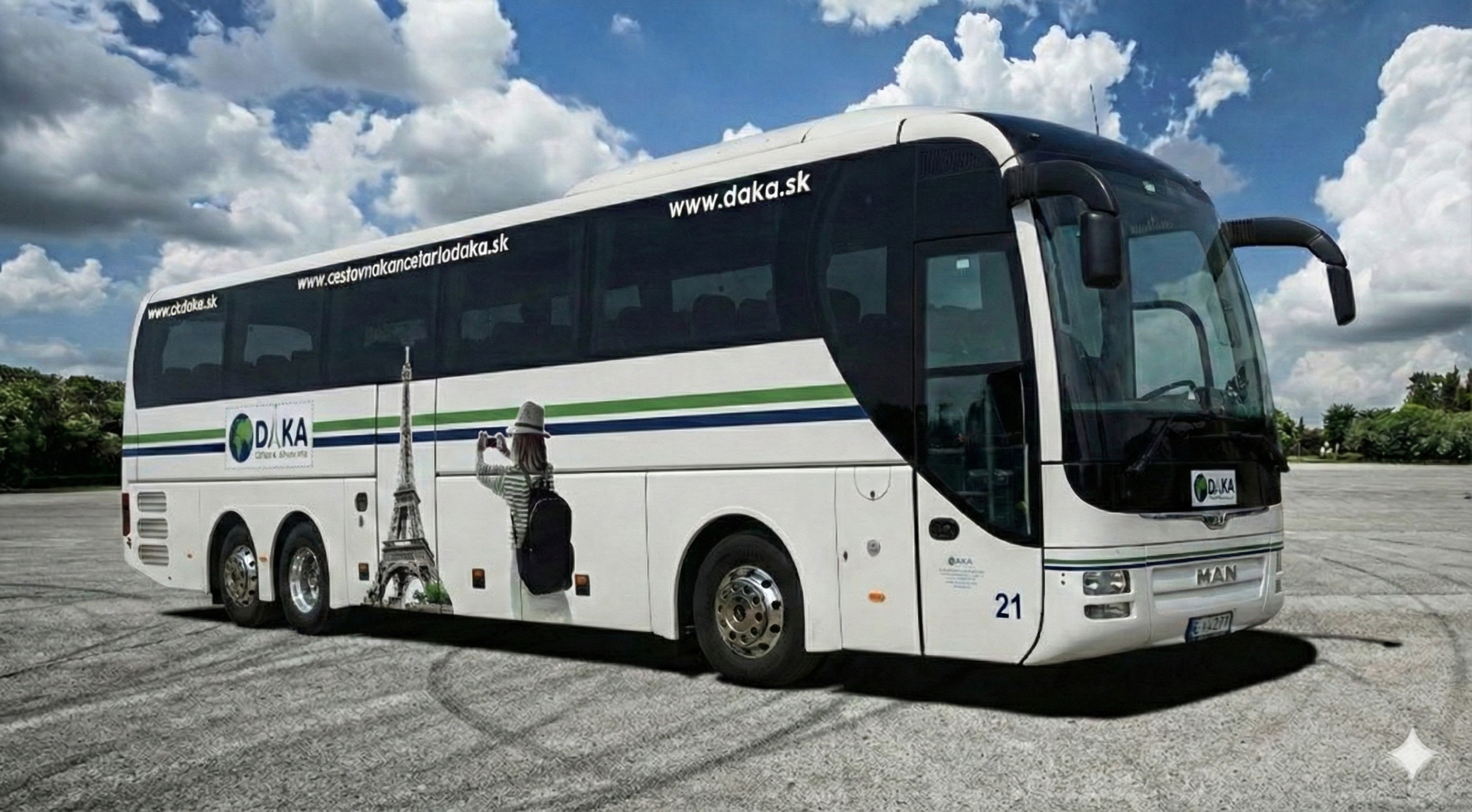 Zájazdový 63 miestny autobus značky MAN elegantnej bielej farby s pohodlnými polohovateľnými sedadlami. Ako privítanie od nás dostanete welcome drink v autobuse v podobe praktickej fľaškovej minerálnej vody zadarmo.