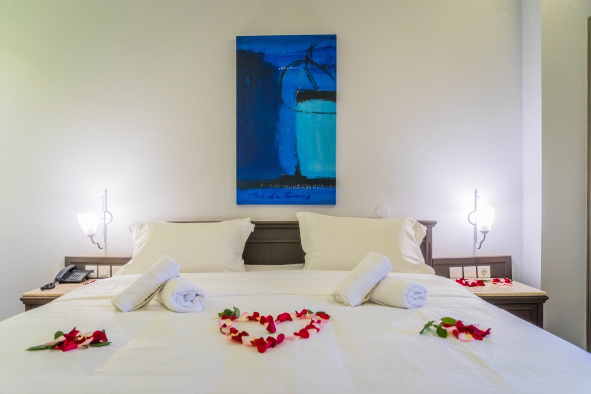 Izby sú vybavené jednotkou tichej klimatizácie (VRV od spoločnosti Daikin), bezplatným Wi-Fi pripojením na internet a 32 "satelitnou LED TV. Priestranné kúpeľne sú vybavené príslušenstvom„ Grohe “, sklenenou dažďovou sprchou, wc a vysoko kvalitnými kúpeľňami. toaletné potreby. Naše luxusné dvojlôžkové izby sa nachádzajú na všetkých poschodiach a každá má vlastný balkón s výhľadom na more, mesto alebo na vnútorné nádvorie hotela. Dvere sa ovládajú pomocou Hi-Tech RFID kariet a každá izba má zvonček s digitálnym displejom, na ktorom môžete pre svoje pohodlie zobraziť správy „Clean My Room“ a „Nerušiť“.