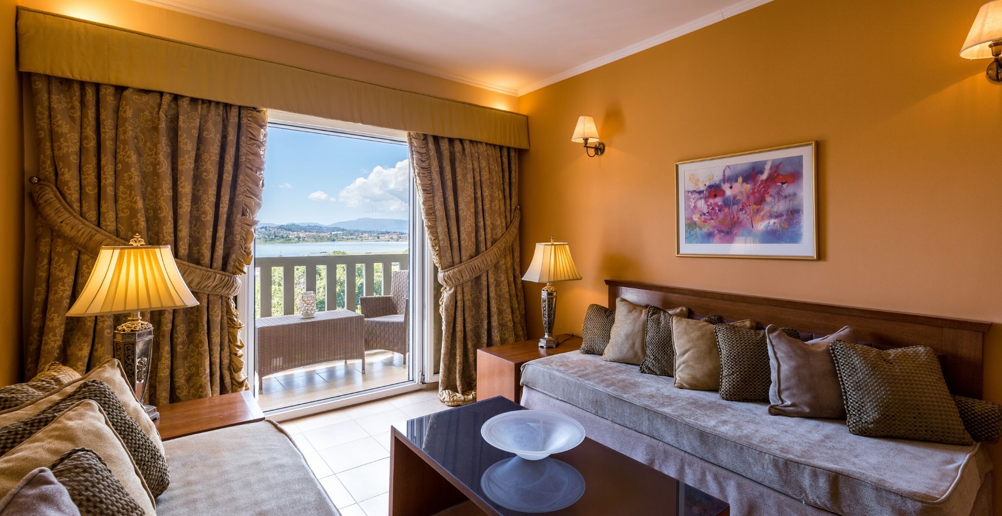 Dvojlôžková izba s výhľadom na jazero (veľkosť 24 m²). Ideálne pre páry a hostí prichádzajúcich za oddychom. Môžu sa tu ubytovať až 3 dospelí s oddelenými posteľami. Kúpeľňa s vaňou, sušičom vlasov, toaletnými potrebami, TV, telefónom s priamou voľbou, minichladničkou, práčovňou, klimatizáciou a bezplatným Wi-Fi pripojením na internet. Všetky izby majú balkón s výhľadom na hory a mesto. Balkón s výhľadom na morské jazero a polostrov Kanoni.