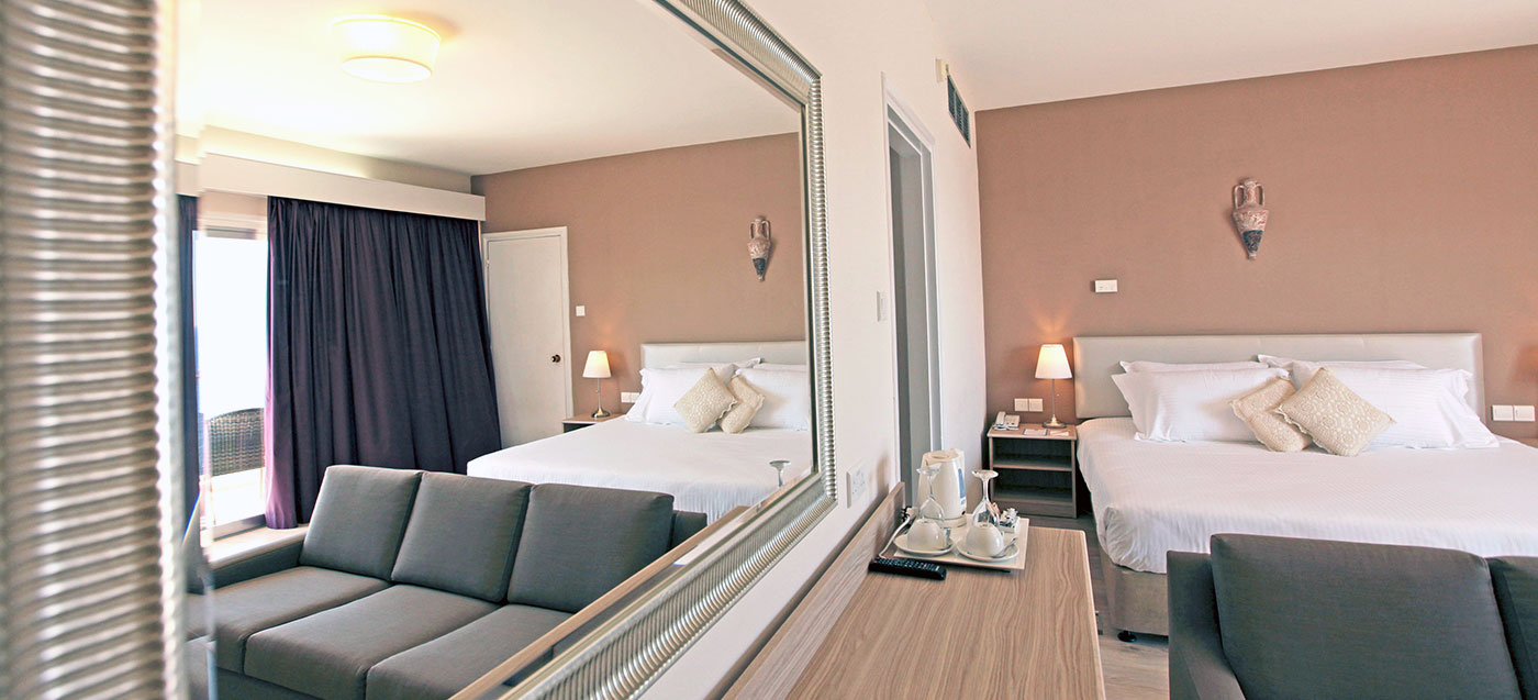 možnosť obsadenia 2 dospelé osoby a 1 dieťa (prístelka) alebo 2 dospelé osoby a 2 deti (2prístelky) alebo 3 dospelé osoby (prístelka). Priestranná izba, ideálna pre rodiny s deťmi. Naša rodinná izba je vybavená posteľou, 2 prístelkami pre deti, toaletným stolíkom, obývacou izbou s 2 pohovkami a stolom, stojanom na batožinu, šatníkovou skriňou a priestrannou kúpeľňou s vaňou. Izba je vybavená posuvnými dverami s dvojitým zasklením, ktoré sú zvukovo izolované a zaisťujú izoláciu vonkajších zvukov. Všetky naše izby s výhľadom do vnútrozemia majú zariadený balkón s výhľadom na pohorie Yermasoyia.