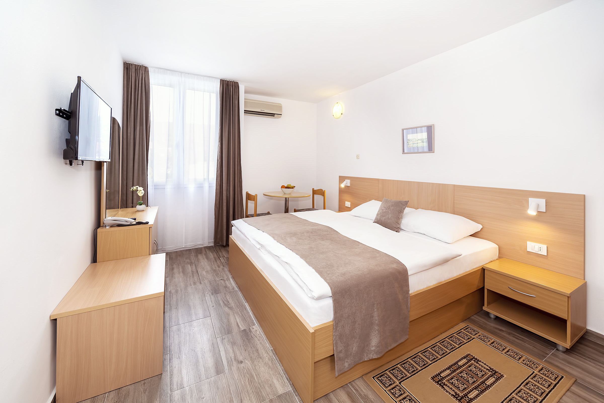 Hotel Omorika sa nachádza v pokojnej časti mestečka Punat na ostrove Krk, len 100 metrov od pláže, obklopený bujnou stredomorskou vegetáciou. Tento trojhviezdičkový hotel ponúka ideálne prostredie pre kvalitnú rodinnú dovolenku, romantický pobyt alebo aktívny oddych pri mori. Hotel disponuje komfortne zariadenými izbami, ktoré ponúkajú výhľad na more alebo do záhrady. Každá izba je vybavená klimatizáciou, TV so satelitným príjmom, chladničkou, telefónom, kúpeľňou so sprchou a sušičom vlasov. Izby sú vhodné pre páry aj rodiny, pričom niektoré rodinné izby sú vybavené oddeleným detským priestorom s poschodovou posteľou. Hotel ponúka polpenziu formou bufetu, ktorá zahŕňa raňajky a večere s výberom teplých a studených jedál, nealkoholické nápoje (limonáda, jablčný džús, voda) počas večere. K dispozícii je aj à la carte reštaurácia s priestrannou terasou, kde si hostia môžu vychutnať miestne špeciality a medzinárodnú kuchyňu. Okolie hotela je ideálne pre aktívny pobyt aj relax. V tesnej blízkosti sa nachádza kamenisto‑betónová pláž s možnosťou prenájmu ležadiel a slnečníkov. Hostia môžu využiť športové aktivity ako mini golf, plážový volejbal, windsurfing, potápanie či rybolov. Mestečko Punat ponúka reštaurácie, kaviarne, cukrárne a obchody so suvenírmi, a jeho atmosféra dýcha typickým mediteránskym šarmom. Medzi služby hotela patrí 24-hodinová recepcia, bezplatné Wi-Fi pripojenie, hotelová záhrada a terasa, detské ihrisko, prenájom bicyklov a organizácia výletov. Hotel je vhodný pre hostí všetkých vekových kategórií, ktorí preferujú pohodlie, pokoj a aktívny pobyt v krásnom prírodnom prostredí.