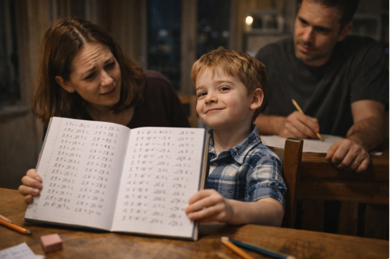 Syn (druhak) mava na DU kazdy den aj "domacu pripravu" zadanu zo skoly - ma par viet napisat, precitat kratky text, a pod. Posledne tyzdne pred vianocnymi prazdninami pani ucitelka pisala, ze sa s detmi dohodla, ze domacu pripravu budu robit rodicia, aby mali deti trocha oddych a aj zabavu z toho, ze rodicom budu zadavat ulohy. Posielam foto, ako sa toho zhostil nas syn - velky vymyselnik. Ked som tie priklady videla, radsej som to posunula rovno muzovi na vyratanie