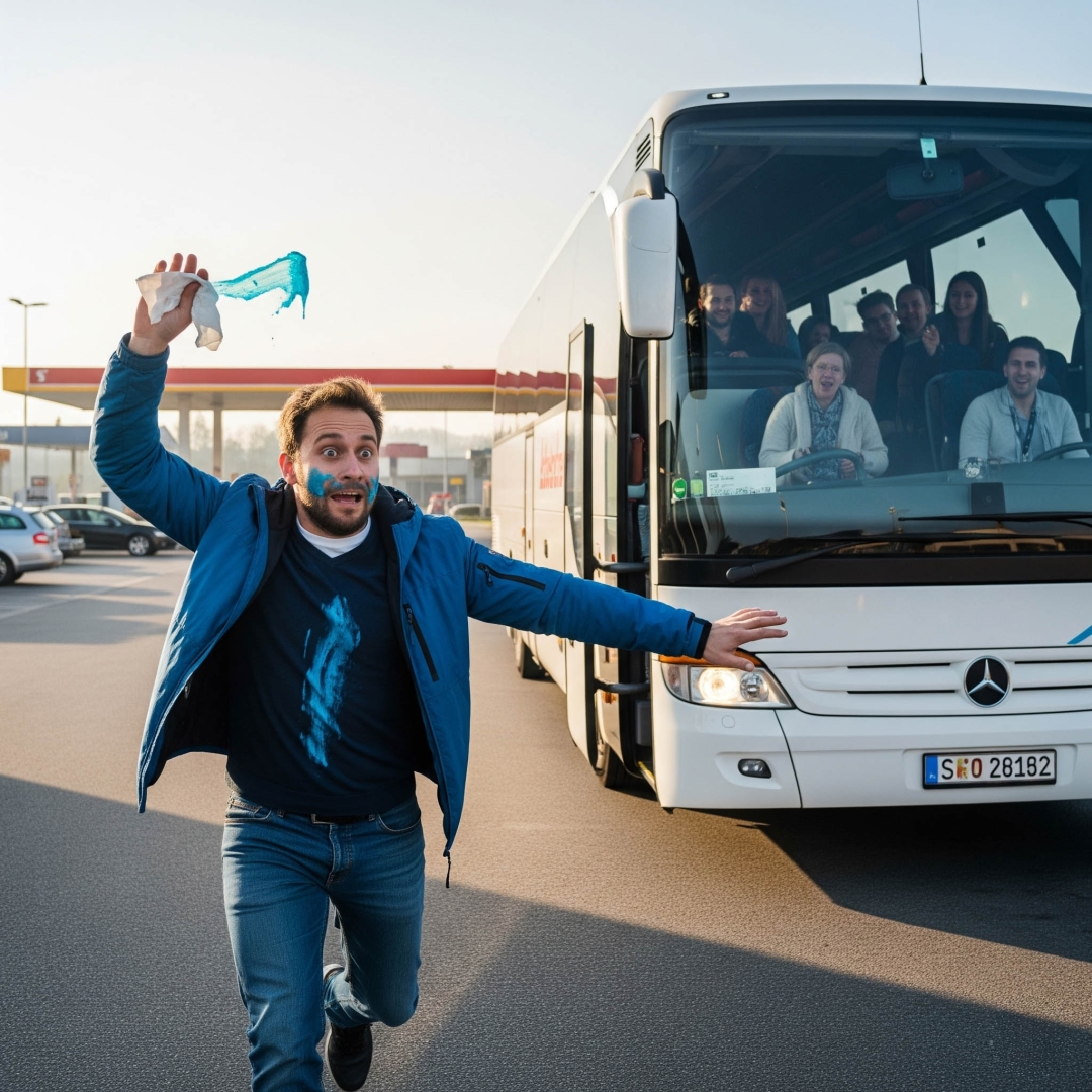 Vybehol som z autobusu strednými dverami a začal sa „umývať“ vlhčenými obrúskami. Vtom sa autobus zavrel a pohol. Utekal som za ním, mával obrúskou plnou pasty a šofér, keď zastavil, sa pýta: „Čo robíš vonku?“ Vysvetlil som mu, že som mal „nehodu s pastou“.