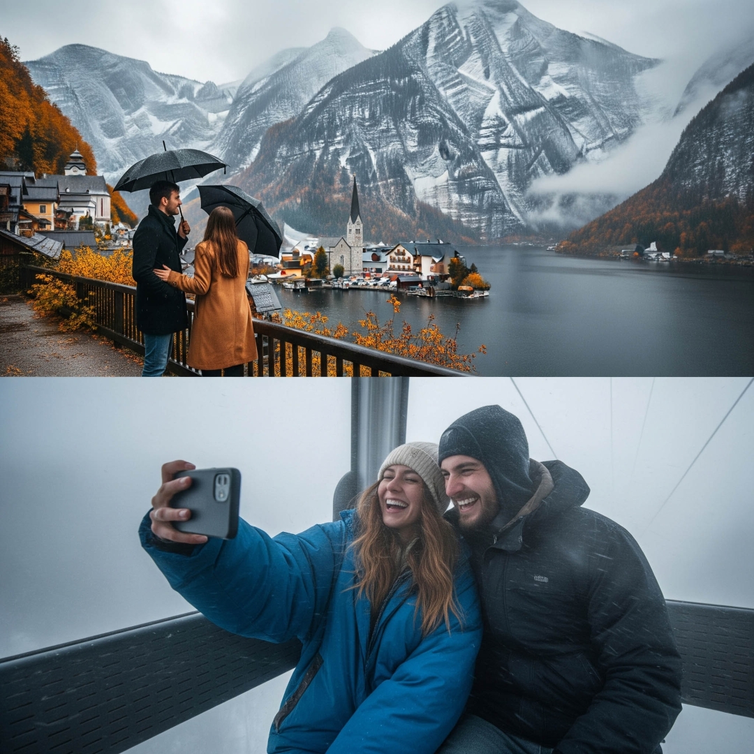 S Dakou sme navštívili okrem iného aj Hallstatt – čarovné miesto. U nás bol krásny jesenný slnečný septembrový deň, ja s priateľom v roztrhaných rifliach – však je to v móde – mikinka, vesta. Došli sme na miesto a pršalo, a keď sme lanovkou vyšli na Dachstein, fujavica, sneh a výhľad sme si mohli pozrieť akurát na fotkách z internetu. Zlatá milá pani mi požičala modrú bundu – ďakujem. No napriek všetkému bol výlet krásny a zážitok na celý život. ❤️ Stále, keď na to spomíname, s priateľom sa na tom smejeme.